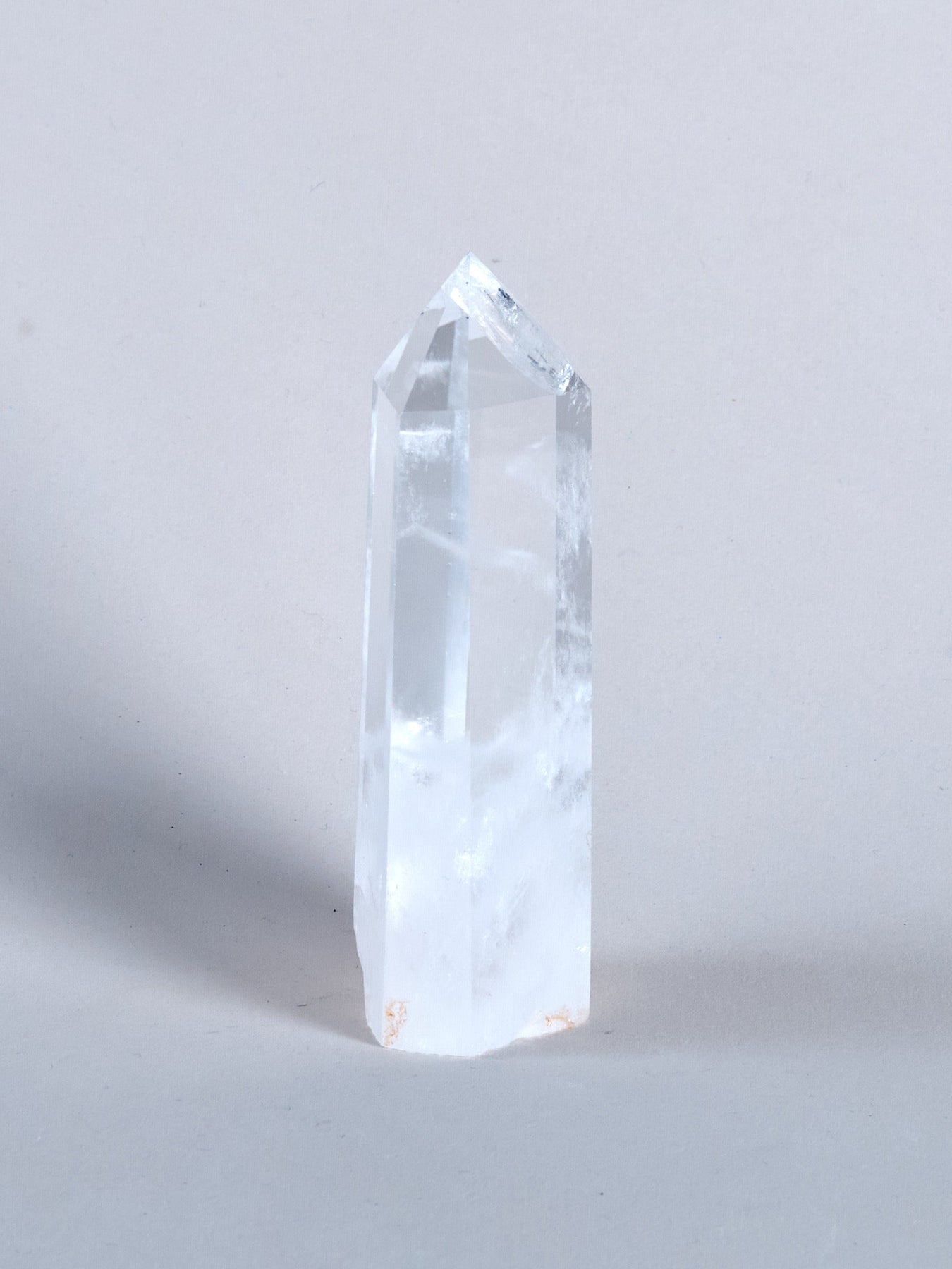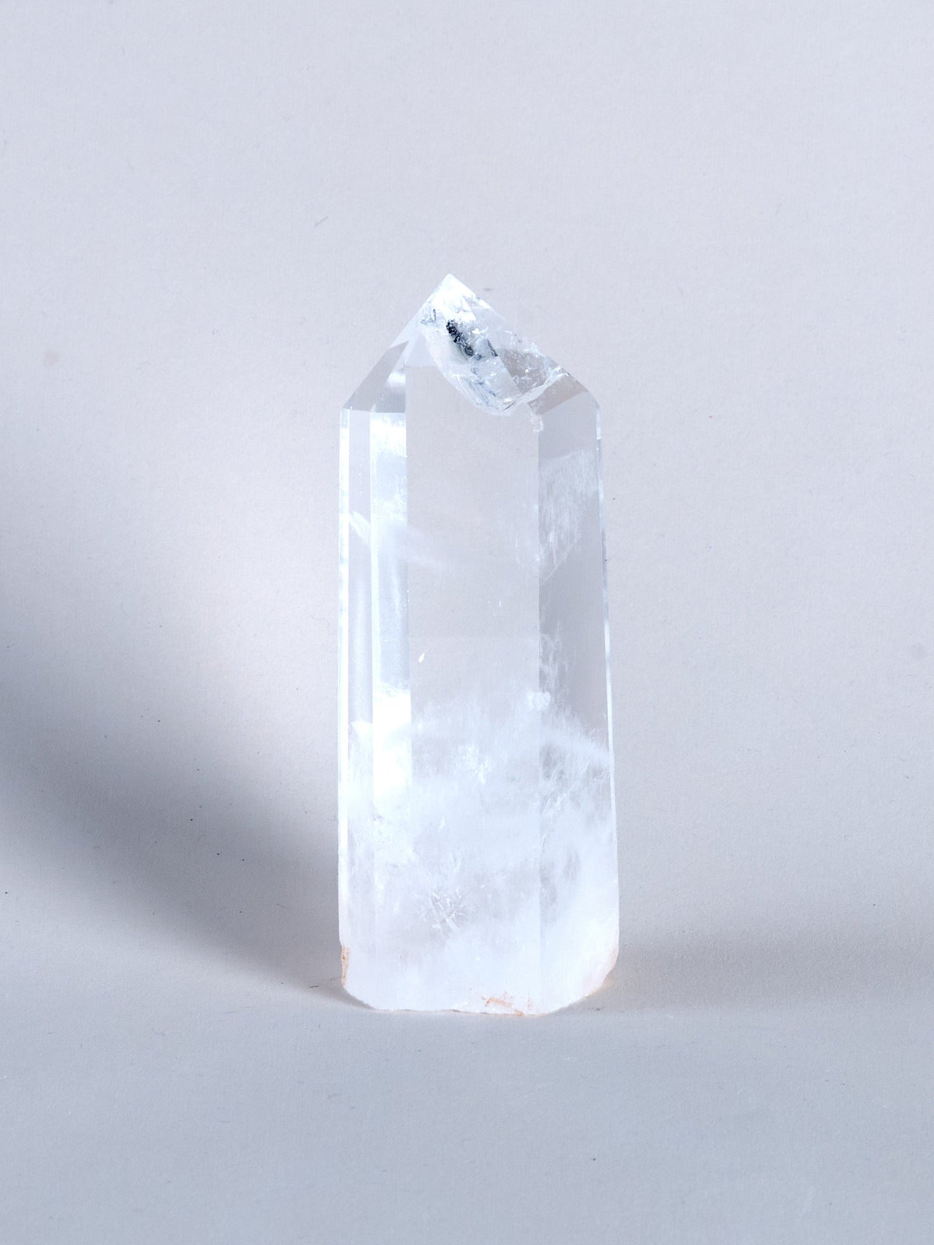 Die Bergkristallspitze ist ein Unikat und wiegt 380 g. Sie ist 13,5 cm hoch und ist unten am Fuß 4 × 5,5 cm.