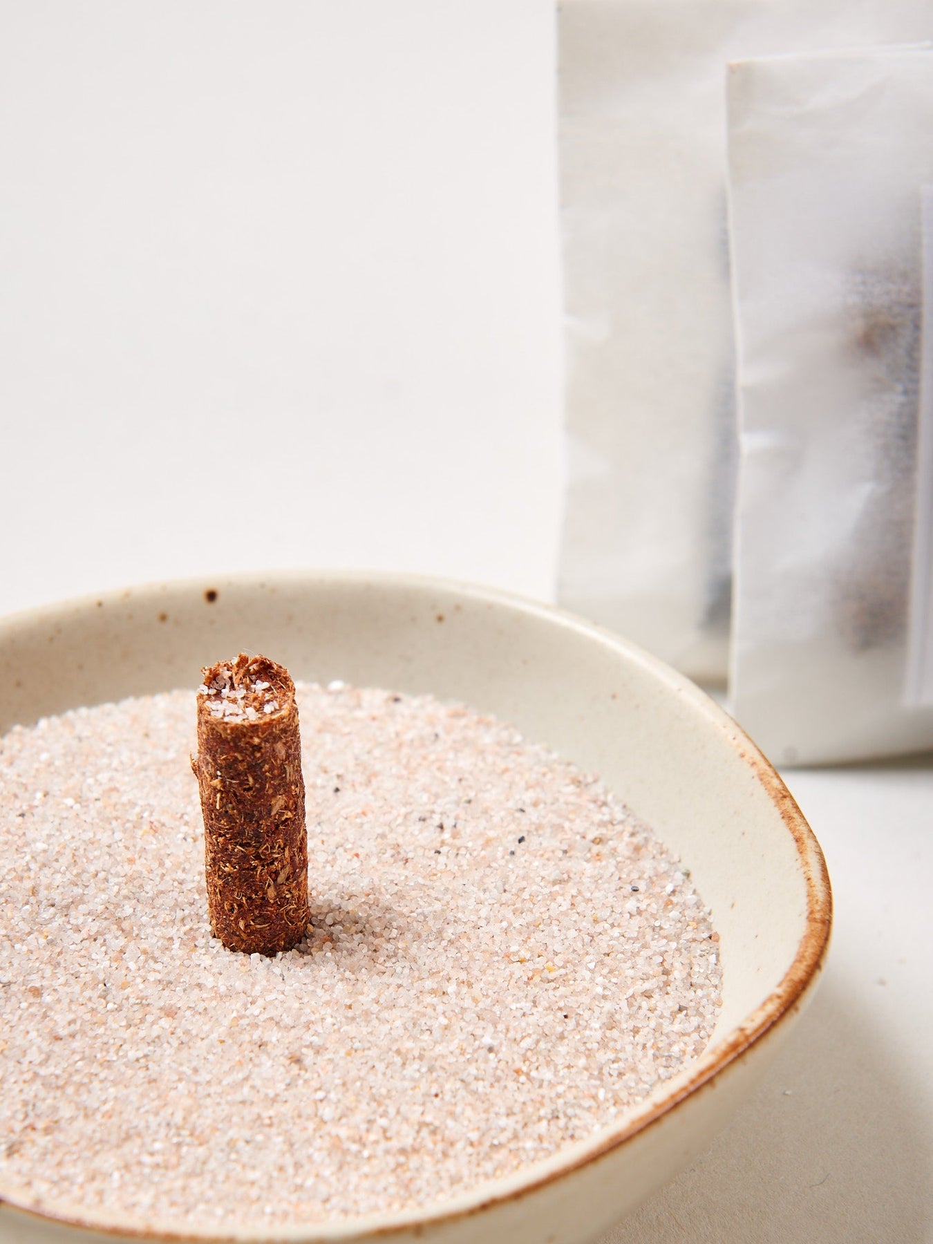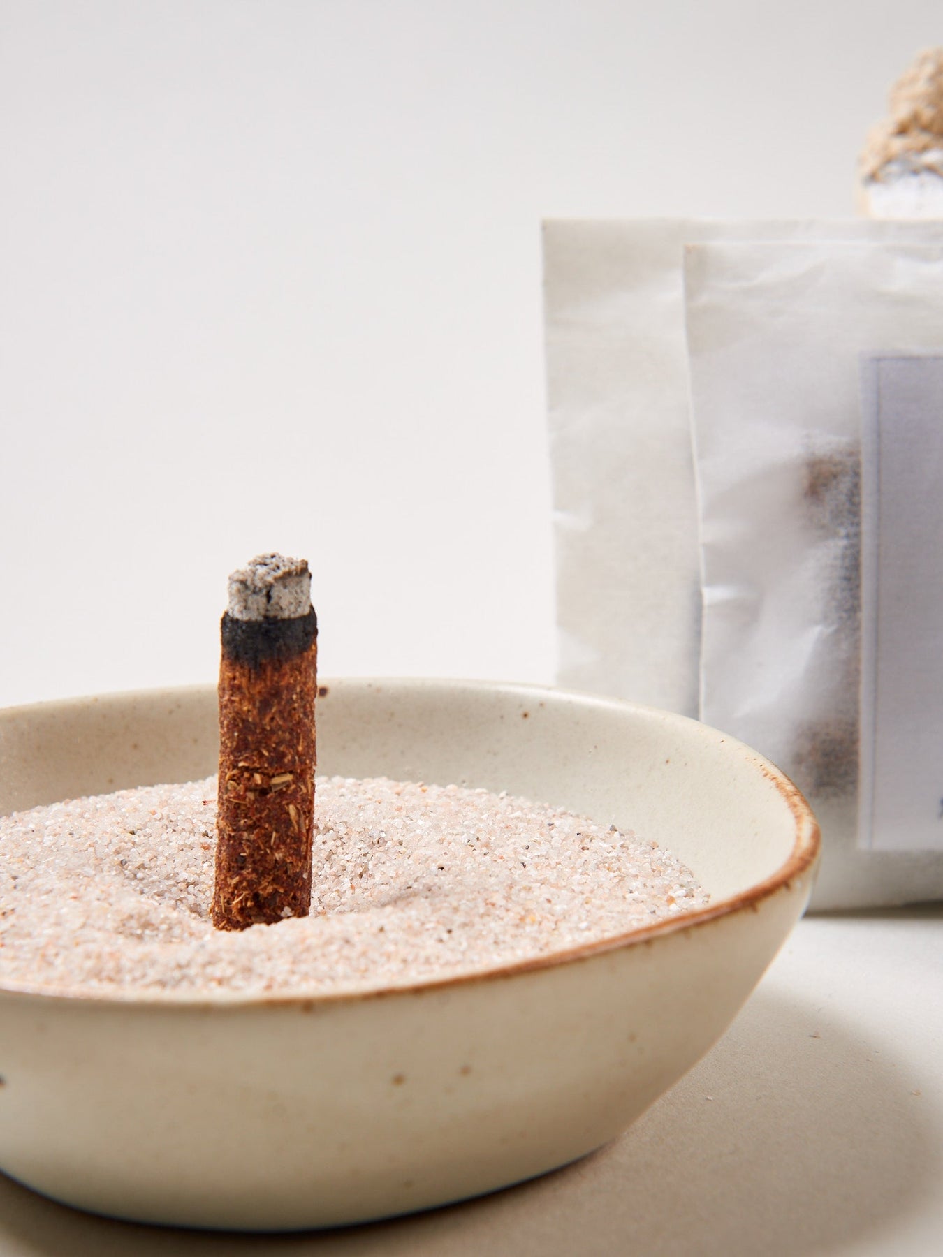 Außerdem werden sie liebevoll von Hand in Hamburg für uns angefertigt. Die Räuchermischung, die du sonst auf Kohle verbrennen würdest, ist für die Glimmstängel fein gemahlen und in Form gerollt worden: 100 % natürliche Harze, Kräuter und Hölzer, ohne Zusätze. Mehr Nachhaltigkeit geht eigentlich nicht.