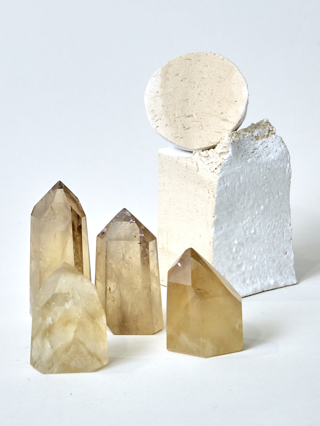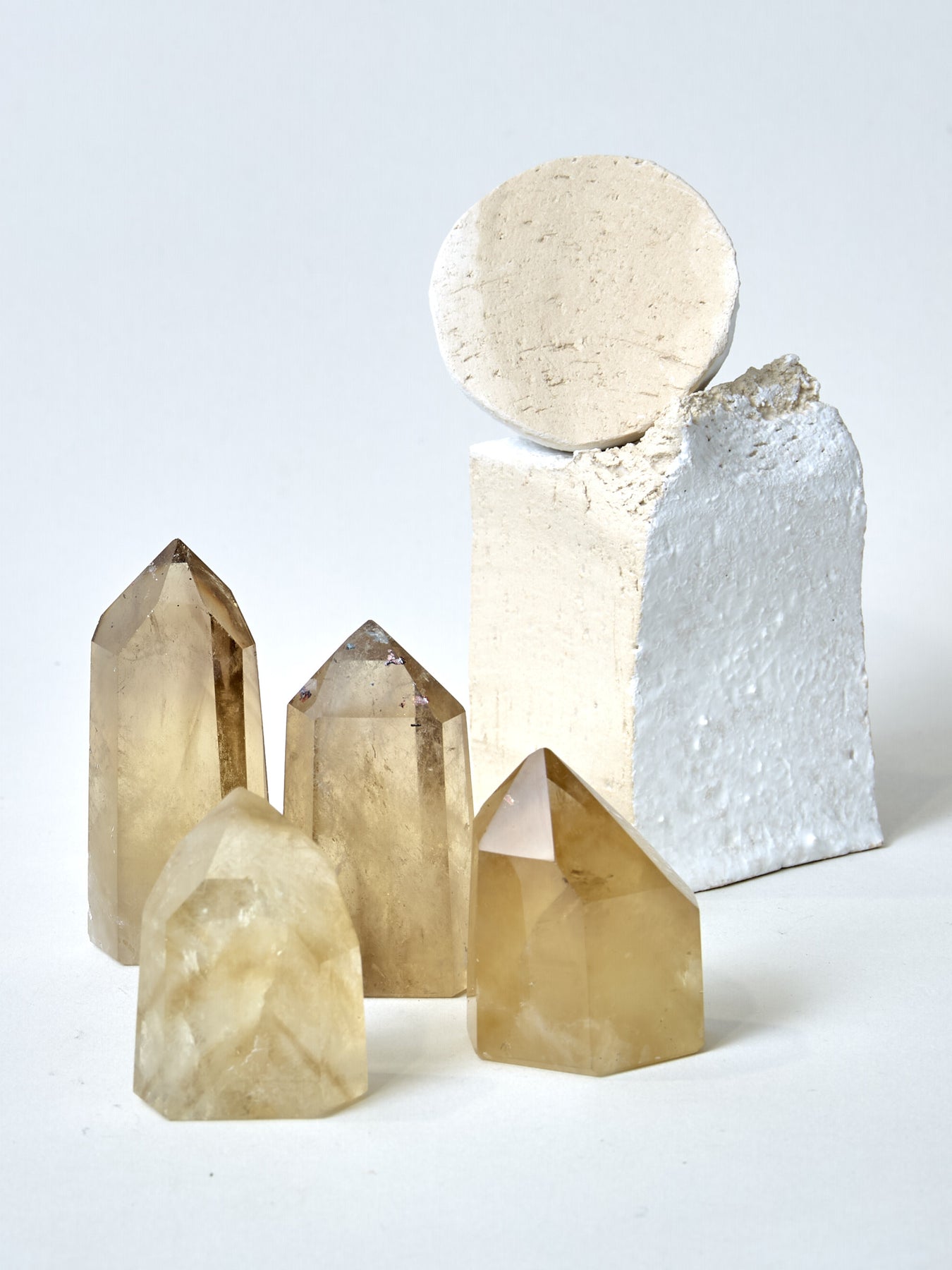 Citrin steht für Ausstrahlung, Fülle und Selbstbewusstsein. Ungebrannter, natürlicher Citrin ist selten und ist schwer zu bekommen. Diese polierten Spitzen haben eine helle, honiggelbe Färbung und tragen viel Licht in sich.
