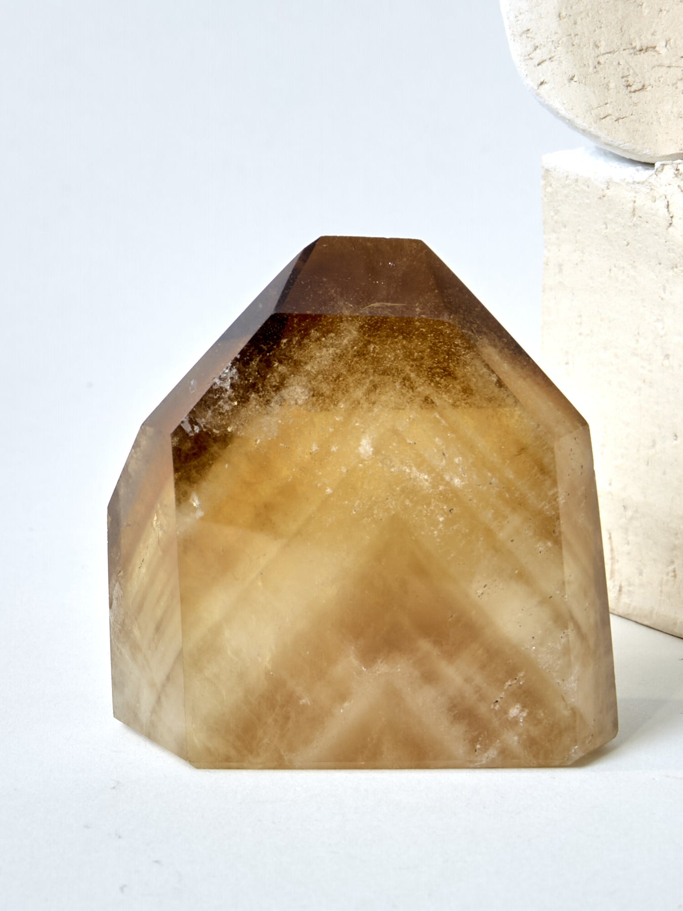 Diese außergewöhnliche Citrinspitze trägt das goldene Licht der Sonne in sich – warm, tröstend und kraftvoll zugleich. Ihre Farbe erinnert an flüssiges Honiglicht, durchzogen von seltenen Phantomzeichnungen, die wie gespeicherte Erfahrungen aus früheren Zeitaltern wirken.