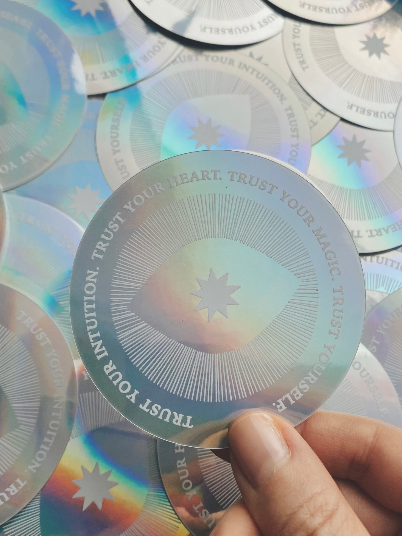 Der Sticker besteht aus glänzender holografischer Folie, die mit weißer Farbe bedruckt ist. Die Illustration zeigt ein magisches Auge, gefüllt mit Sternen, die als Erinnerung für dich dienen: TRUST YOUR INTUITION. TRUST YOUR HEART. TRUST YOUR MAGIC. TRUST YOURSELF.