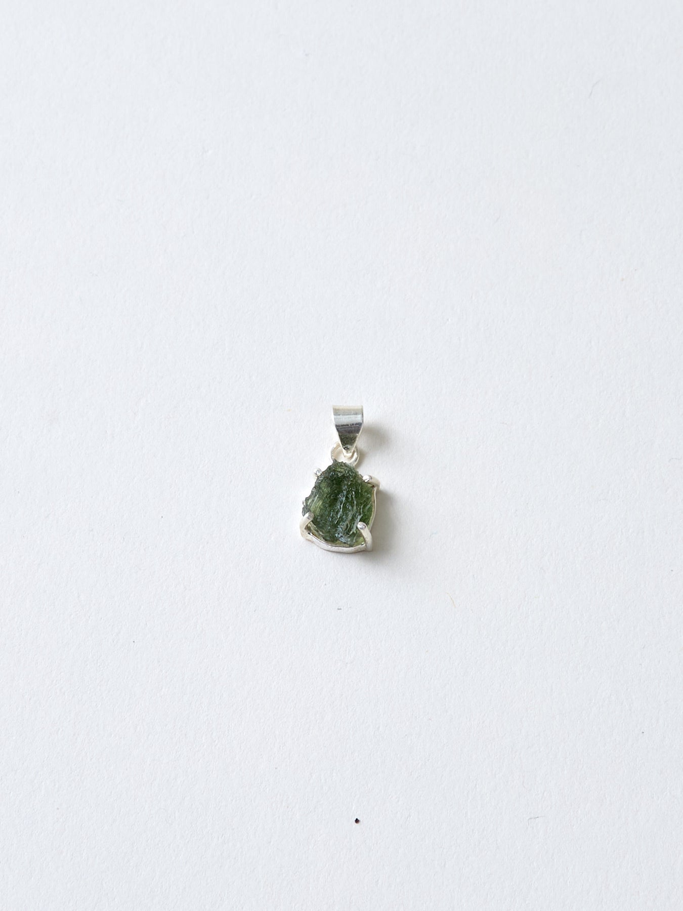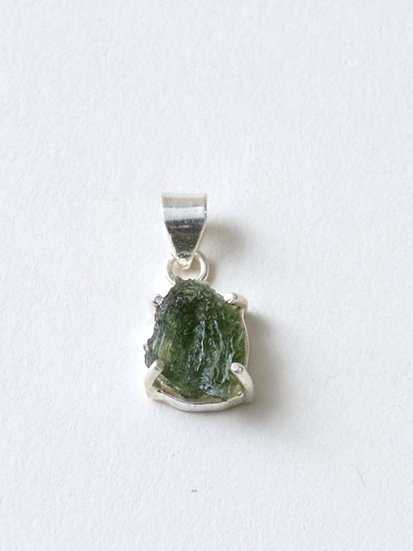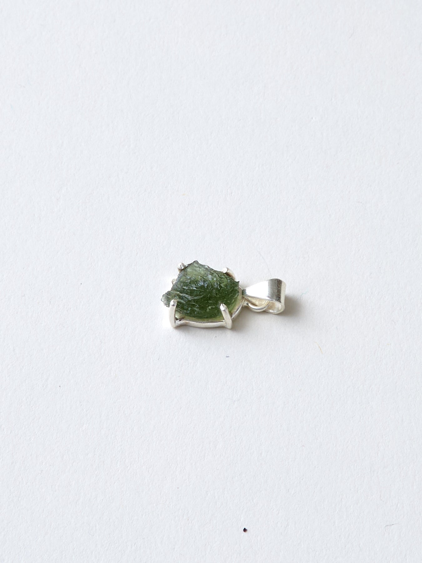 Dieser Moldavit Anhänger ist etwas Besonderes. Er ist in einen Silberstift gefasst, wodurch der Kristall ganz pur und unaufgeregt wirken kann.