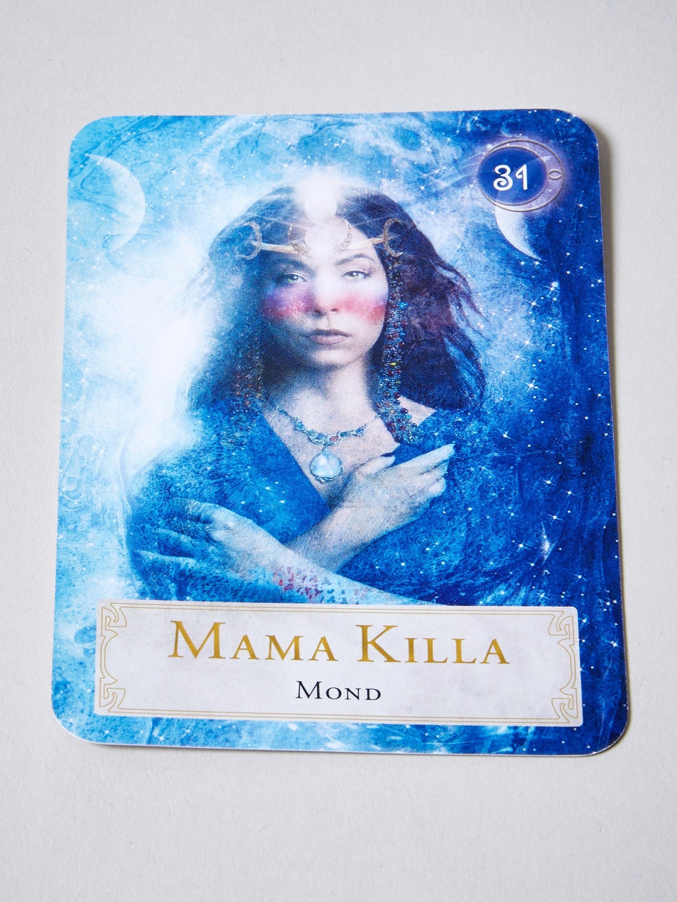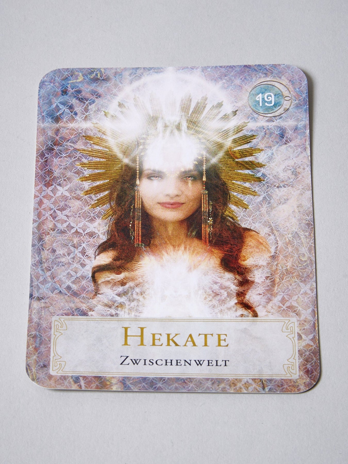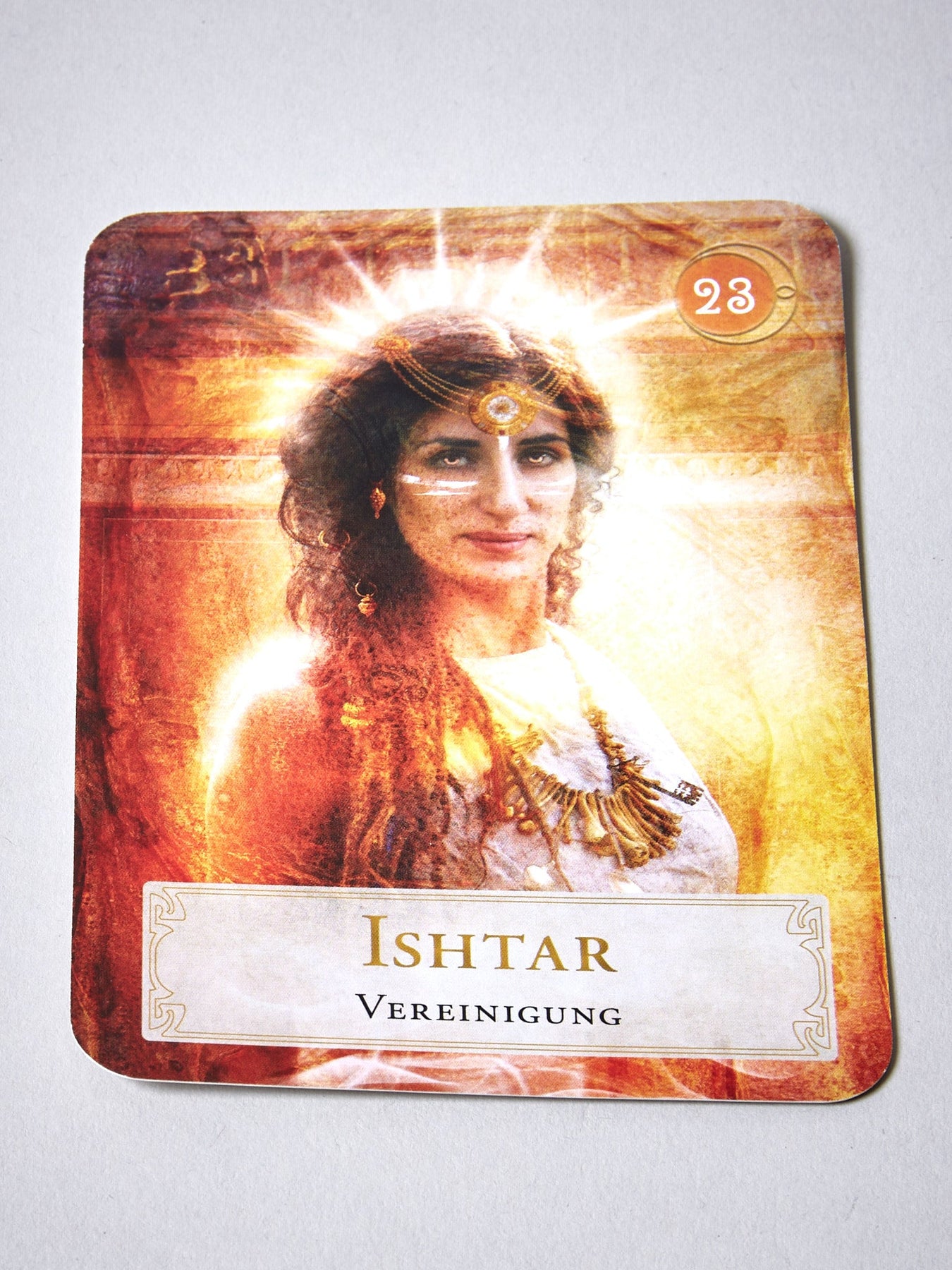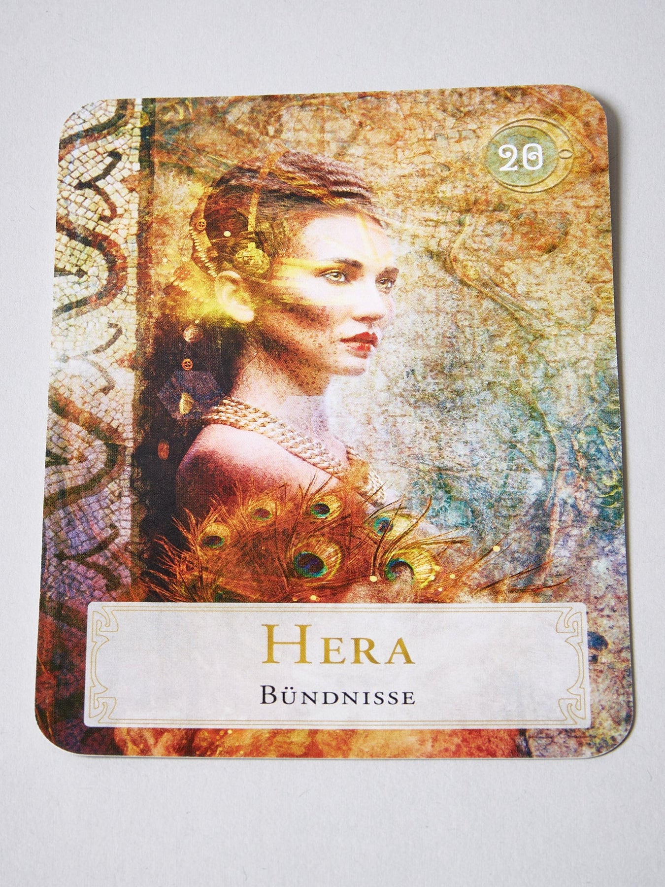 Das Format des Kartendecks kommt diesmal ganz majestätisch daher: XXL-Box mit einem Schuber und ausgestanztem Fenster, das eine Göttin offenbart. Eine stabile Pappschachtel, hochwertig mit dem Magnetverschluss verarbeitet. In der Schachtel befinden sich sowohl das XXL-Booklet mit der Deutung der Karten als auch weiter unten im Herzstück der Box die 52 Karten in einer separaten kleinen Box. Diese kann man mit einem Bändchen herausheben. Die kleine Box wird wie gewohnt mit einem Pappdeckel verschlossen und die innen liegenden Karten lassen sich ebenfalls mit deinem zweiten Bändchen komfortabel herausnehmen.