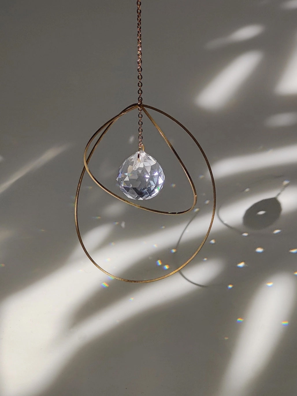 Hängend fängt er das Licht ein und verbreitet subtile Regenbögen, wo auch immer das Licht hinmöchte.