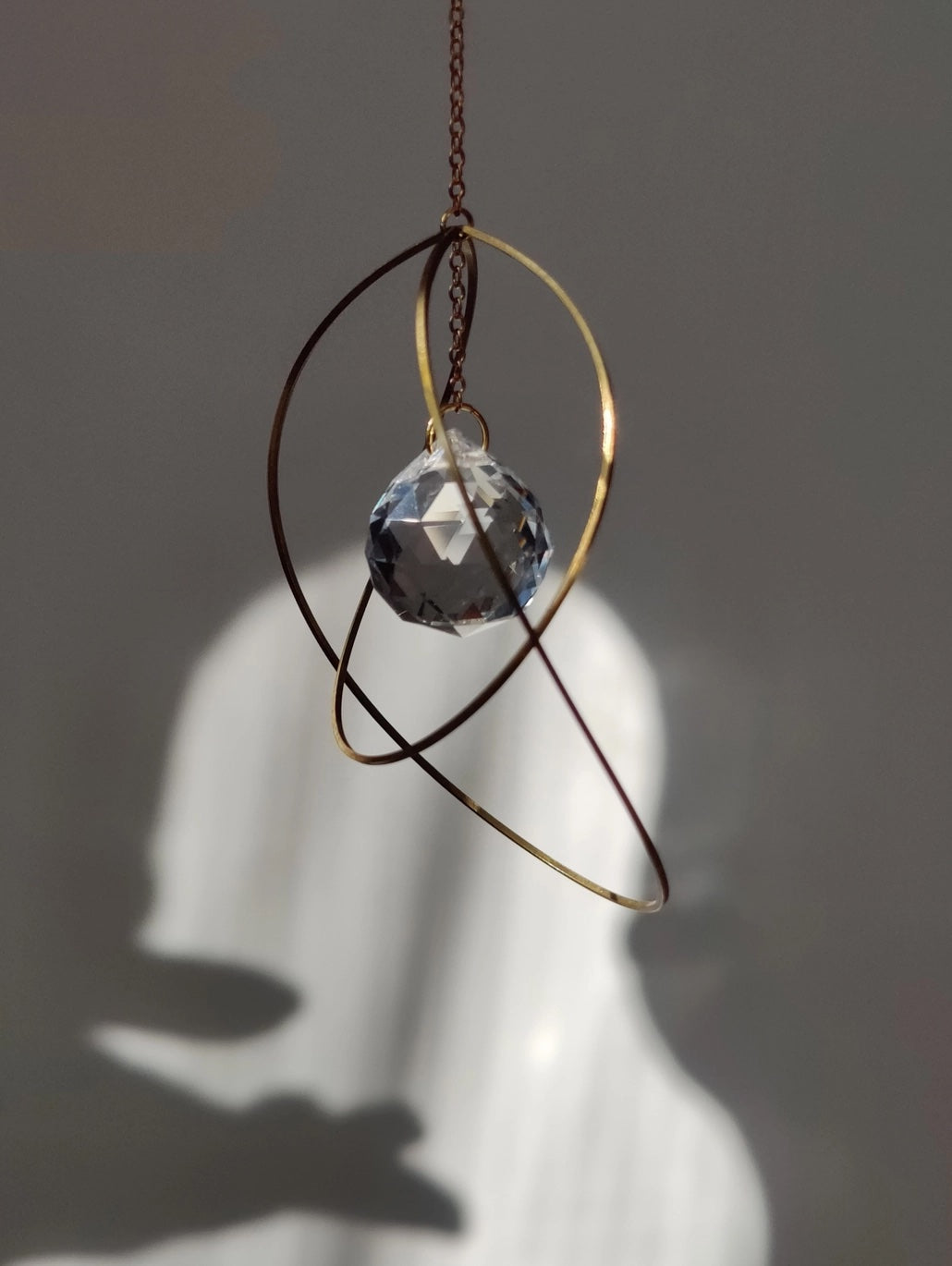 Sonne in unser Leben lassen ist jetzt so leicht! Ether in einem Sonnenfänger, der das Licht bricht und so in allen Farben dein Zuhause in den schönsten Prismenfarben strahlen Seine fließende geometrische Form umschließt einen facettierten Kristall, der das Licht einfängt und in subtile Schimmer verwandelt. Leicht scheint er im Raum zu schweben und bringt eine beruhigende und wechselnde Präsenz.