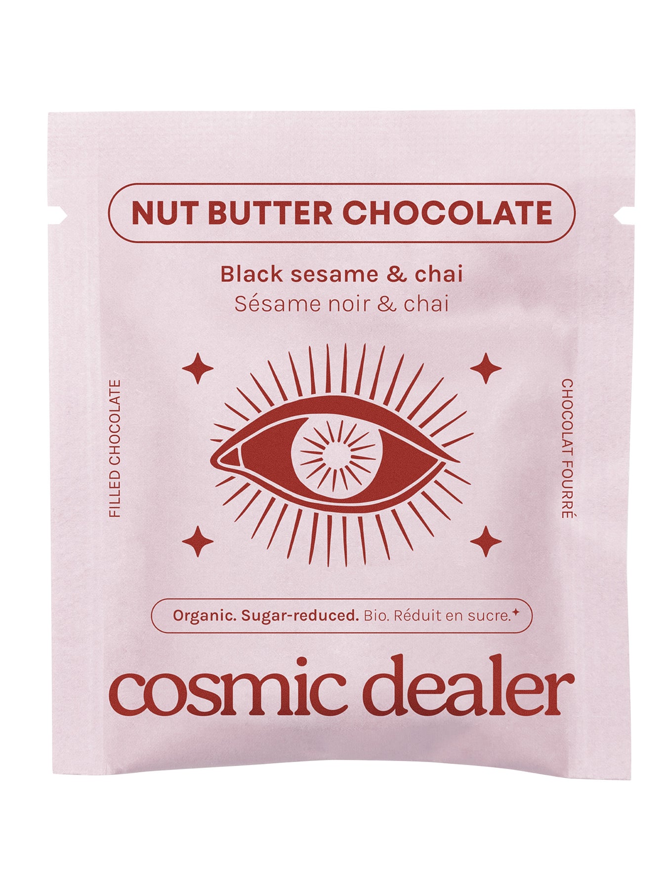 Diese Praline verbindet Roh-Cacao mit schwarzem Sesam (Tahini) & Chai Gewürzen.
