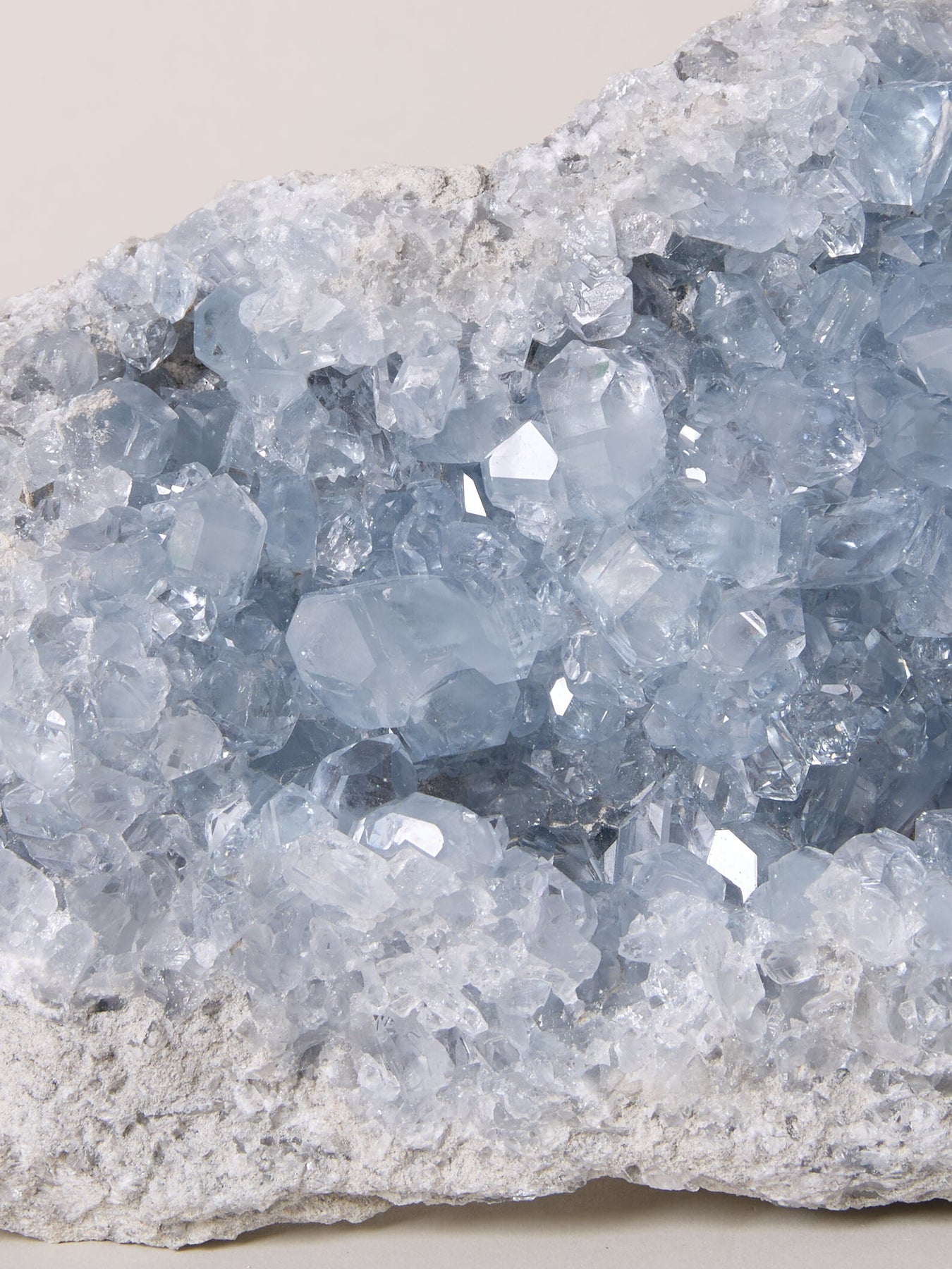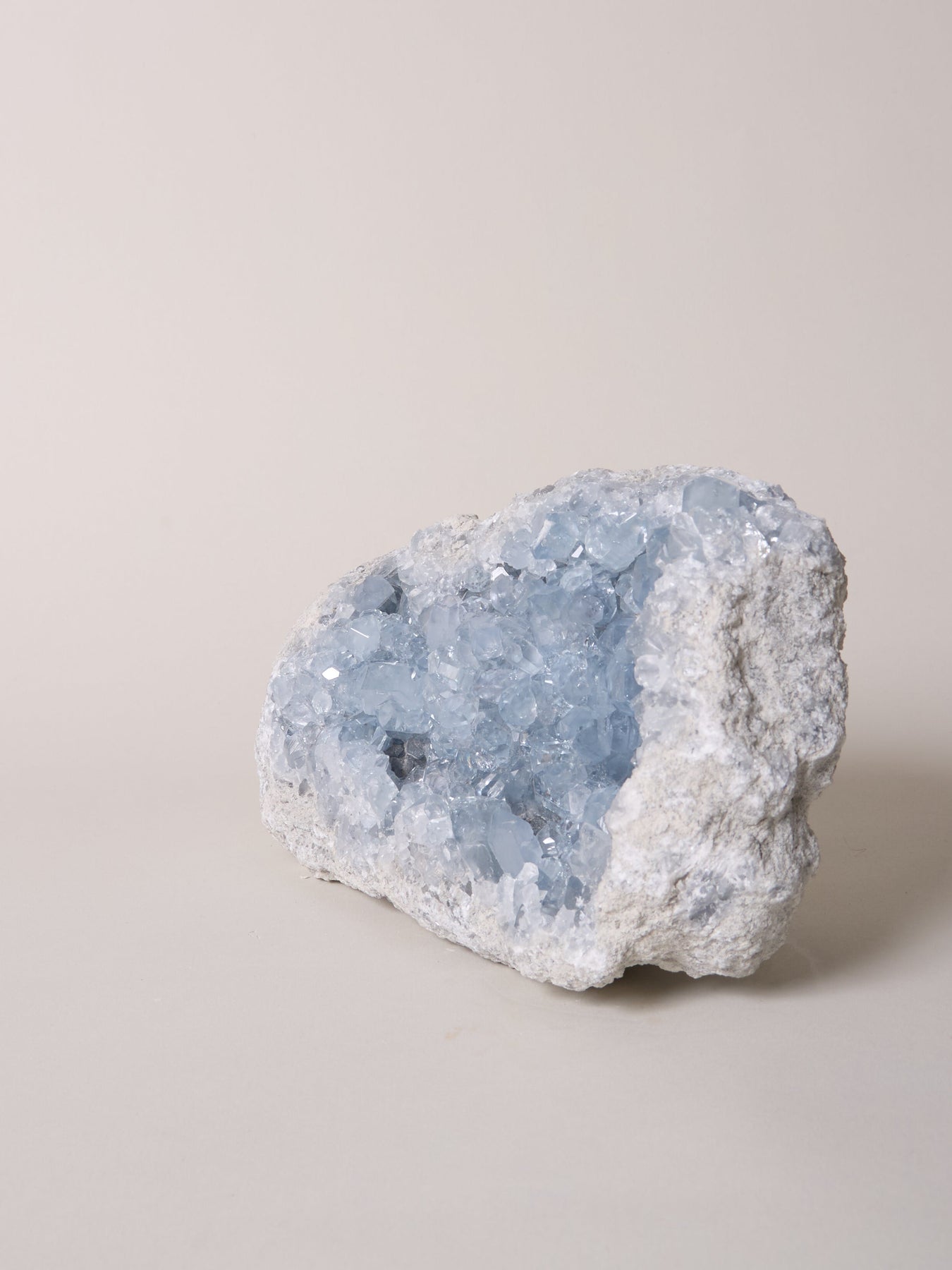 Achtung: Coelestin ist ein eher empfindlicher Stein und bricht leicht. Er sollte nicht über längere Zeit mit Wasser in Berührung kommen, da das Wasser oft den Halt gebenden Sandstein abwäscht und sich dadurch einzelne Kristalle lösen können.