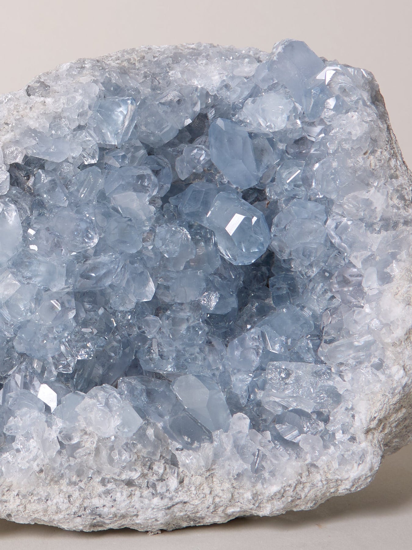 Coelestin ist ein Stein, der uns mit dem Himmlischen verbindet. Diese Stufe ist nicht nur ein Einzelstück, sie ist unglaublich klar, was nicht immer gegeben ist bei Coelestinen. Es ist, als wenn du direkt in den Himmel schaust. Ihre offene Form vermittelt die Empfangsbereitschaft und gleichzeitig den Schutz durch ihre Höhlenstruktur. Das Licht fällt von allen Seiten hinein und lässt sie strahlen.