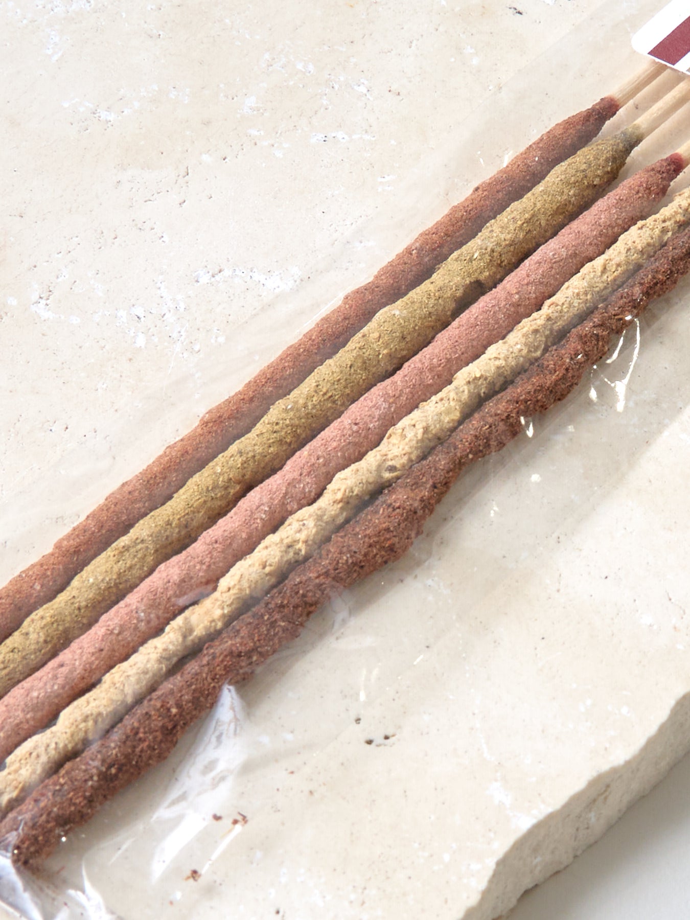 Diese ausschließlich aus Harzen, Hölzern, Kräutern, Blüten und Gewürzen bestehenden Ritual Räucherstäbchen werden von Hand von unseren Partnern in Berlin hergestellt, die es mit viel Expertise und Aufwand schaffen, eine vollständige Räucherung in Räucherstäbchenform zu bringen.