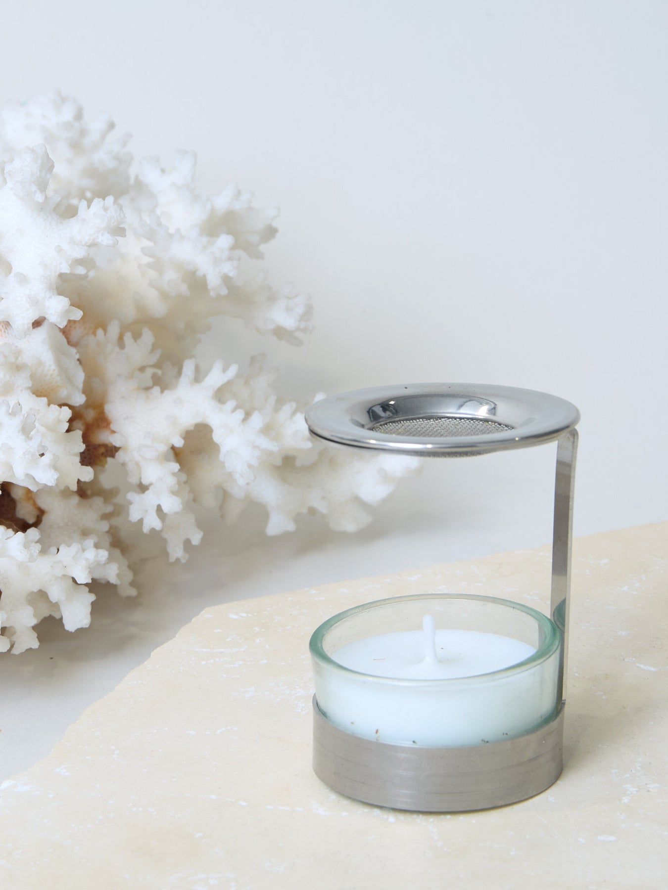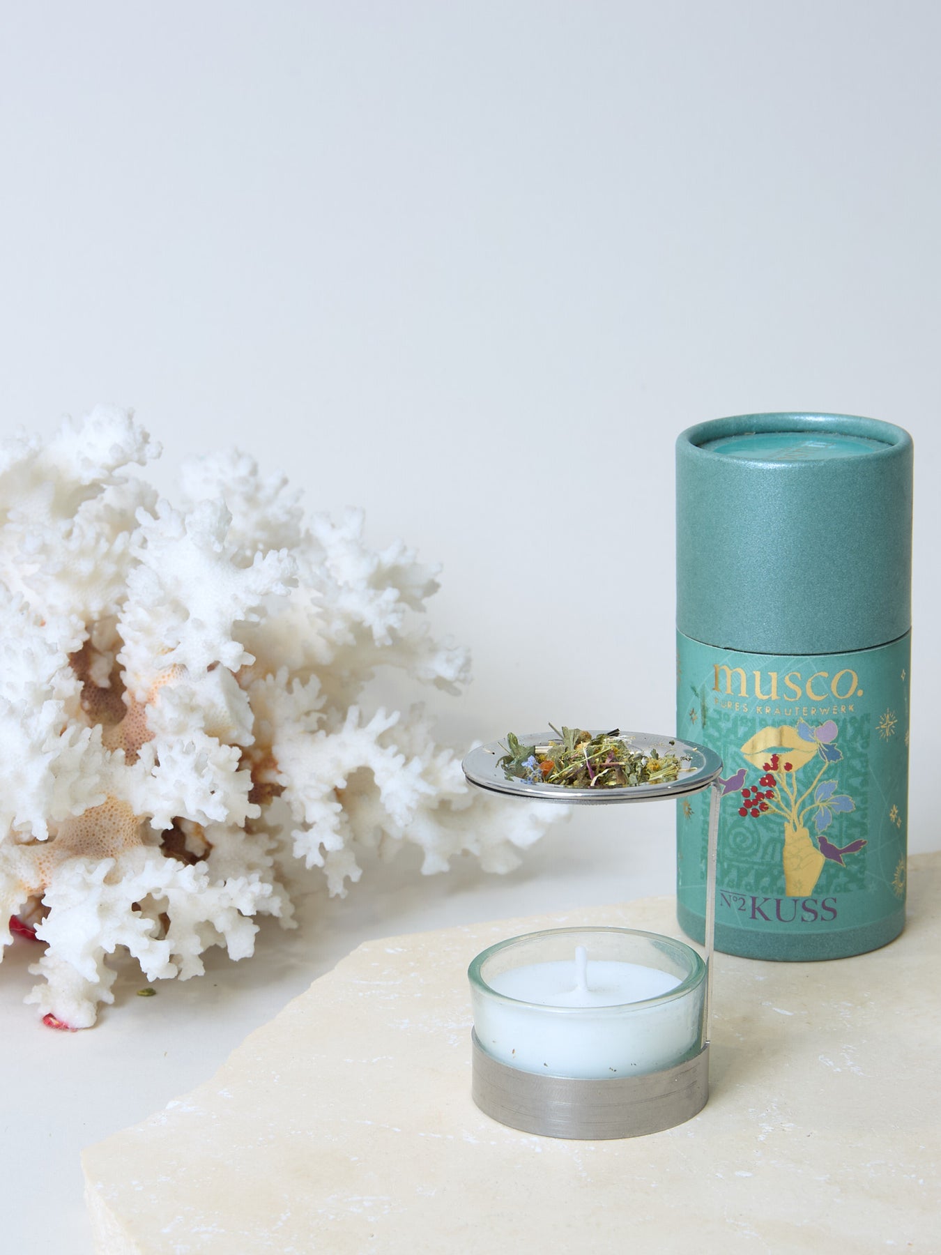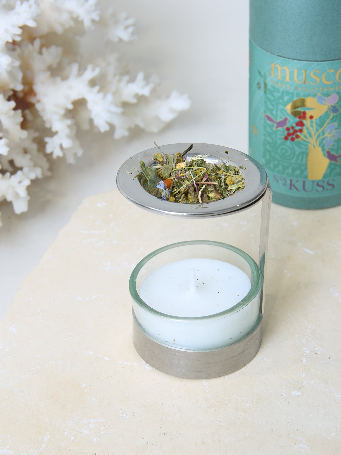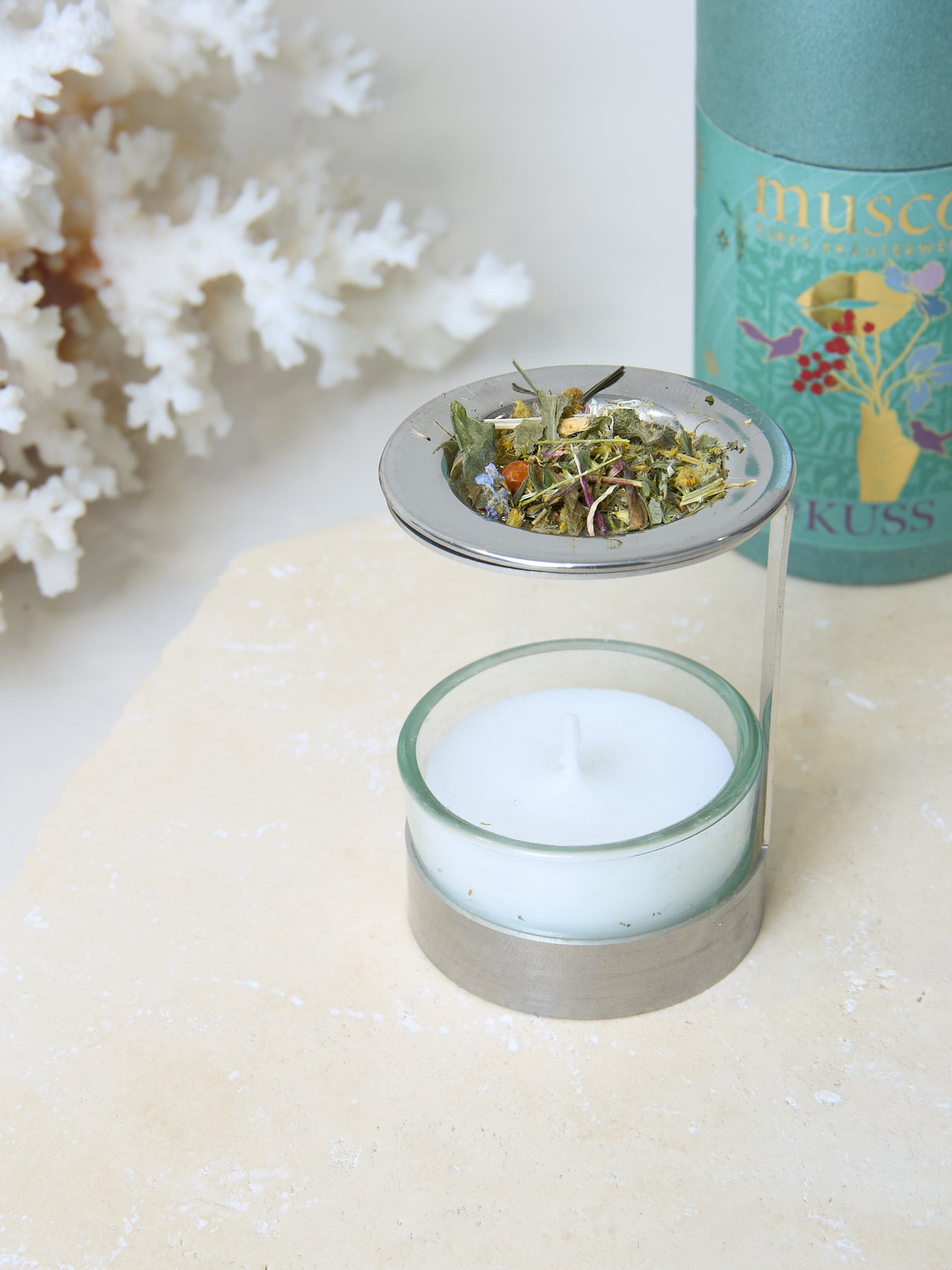 Materialien: Edelstahlhalter, Glas mit Teelicht, Sieb – kommt ohne Räucherwerk