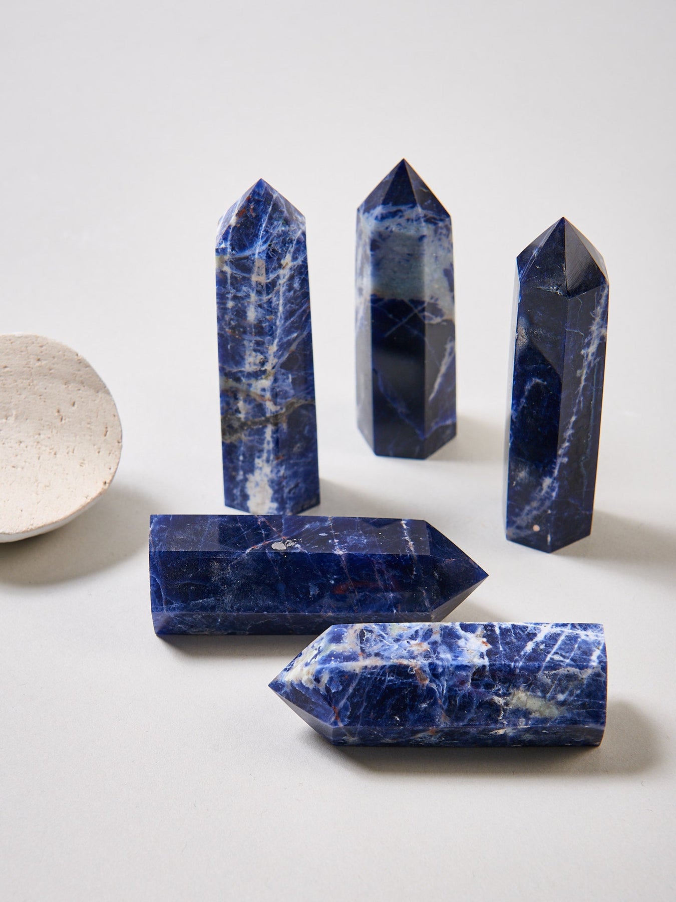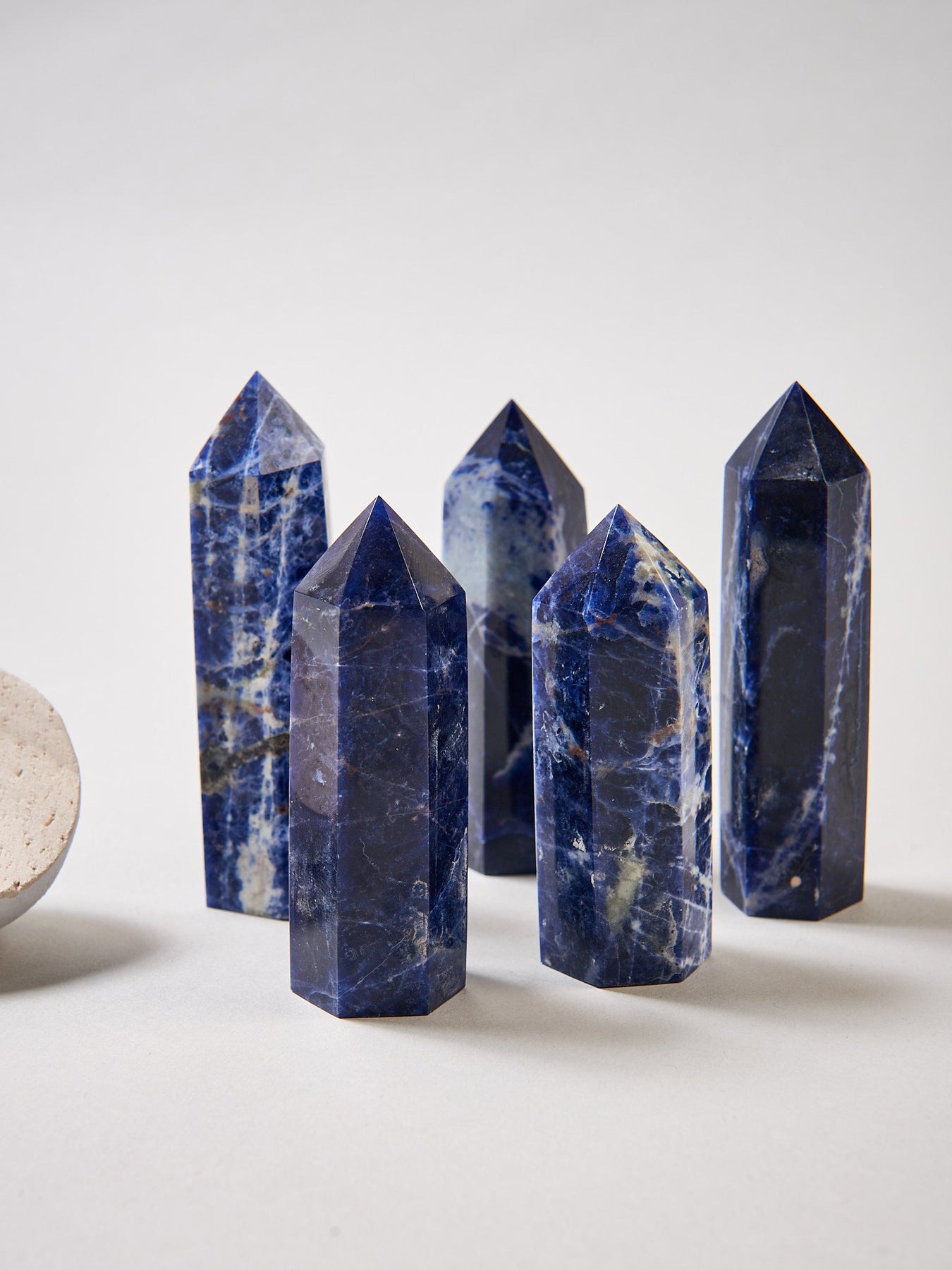 Diese Sodalithspitzen sind von einem tiefen Blau, das von weißen Adern durchzogen wird. Das macht sie optisch sehr ansprechend, und auch energetisch schafft Sodalith eine erhabene Atmosphäre im Raum. In unserer Wahrnehmung bringt er ein Gefühl von Weite und Offenheit, in der sich Verwirrungen klären und sich unsere Visionskräfte entwickeln können.